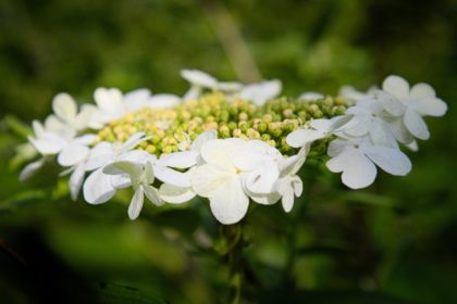KWITNIENIE: V-IX; początkowo białe, z czasem różowieją, kwiaty zebrane w płaskie kwiatostany